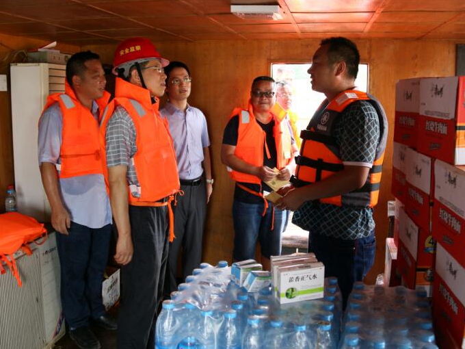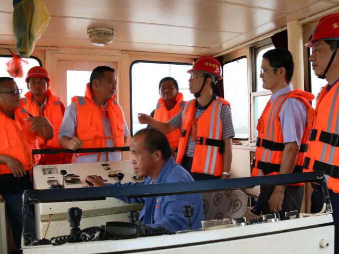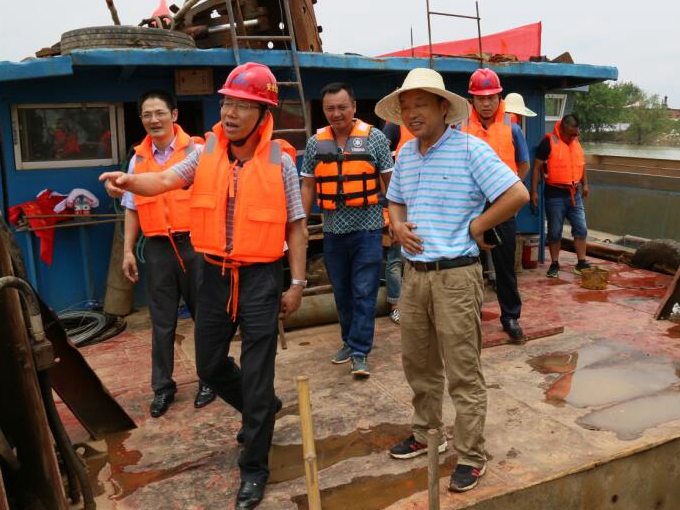 7月14日上午,集團(tuán)公司副總經(jīng)理王厚良、安全監(jiān)察局副主任葛輝在安徽交航公司副總經(jīng)理方申柱、總經(jīng)理助理、疏浚分公司總經(jīng)理董雙武的陪同下來(lái)到青弋江南陵縣四七圩倉(cāng)溪段堤壩抗洪搶險(xiǎn)第一線現(xiàn)場(chǎng)指導(dǎo)抗洪搶險(xiǎn)工作。王總一行首先登上正在青弋江河道中進(jìn)行河道清淤的“蛟龍?zhí)枴?,查看施工作業(yè)進(jìn)度,指導(dǎo)安全度汛工作。他與船員們親切交談,詳細(xì)了解船舶作業(yè)原理、了解施工中遇到的難點(diǎn),指導(dǎo)船員們?cè)谑┕み^(guò)程中在安全方面應(yīng)該注意的事項(xiàng),囑咐安徽交航公司要做好船員生活的后勤保障工作。上岸后一行人又驅(qū)車趕往南陵縣四七圩倉(cāng)溪段堤壩抗洪搶險(xiǎn)第一線,乘坐沖鋒舟,登上正在潰堤處進(jìn)行施工作業(yè)的抓斗船。登船后,王總與在船上值守的南陵縣水務(wù)局局長(zhǎng)鄭松淼進(jìn)行親切交談。鄭局長(zhǎng)感謝安徽建工、安徽交航公司對(duì)當(dāng)?shù)卣购榫葹?zāi)給予的大力支持,王總表示抗洪搶險(xiǎn)是我們國(guó)有企業(yè)應(yīng)當(dāng)承擔(dān)的社會(huì)責(zé)任,是應(yīng)該的。王總詳細(xì)查看了船上作業(yè)設(shè)備詢問了施工進(jìn)度,對(duì)辛苦作業(yè)的職工們給予鼓勵(lì)和問候,囑咐職工們?cè)谧鳂I(yè)同時(shí)要注意自身安全,并送上了慰問品和慰問金。職工們感謝集團(tuán)領(lǐng)導(dǎo)的關(guān)心,并紛紛表示將不辱使命,發(fā)揚(yáng)安徽建工人不怕苦不怕累,勇于拼搏的精神,爭(zhēng)取盡早完工,讓災(zāi)民們?cè)缛栈氐郊抑小?/FONT>