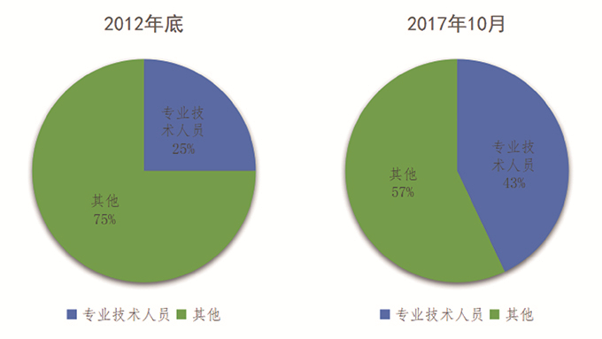 從實際出發(fā)、砥礪前行,職工結(jié)構(gòu)化素質(zhì)水平穩(wěn)步提升。第一次黨代會以來,公司人員隊伍規(guī)??焖僭鲩L。截至2017年10月初,公司職工總數(shù)近500人,與第一次黨代會職工總?cè)藬?shù)相比,增加近200人,增幅達到63.7%。其中,專業(yè)技術(shù)人員由不足百人增長到近200人,增長比例183.9%。經(jīng)過優(yōu)化,職工隊伍結(jié)構(gòu)更趨合理,專業(yè)技術(shù)人員職工總量的比例由原來的25%提高到43%。
