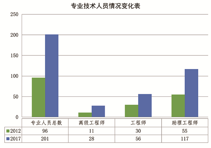 專業(yè)技術(shù)隊伍中,新晉1名正高級工程師,高級工程師及以上職稱共28人,相比第一次黨代會增加17人,增幅達到154.5%;工程師56人,增加26人,增幅為86.7%;助理工程師117人,增加62人,增幅為113%。