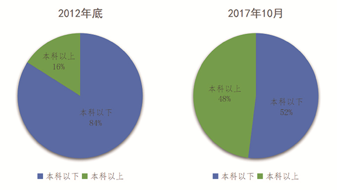學(xué)歷結(jié)構(gòu)方面,具有研究生學(xué)歷的18人,增加16人,增幅為800%;具有本科學(xué)歷的178人,增加141人,增幅為381.1%,本科及以上職工總量比例由原來的16%提高到48%。