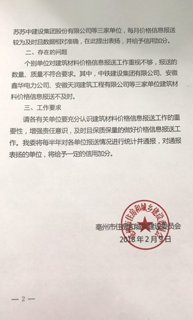 2018年2月9日,亳州市住房和城鄉(xiāng)建設(shè)委員會(huì)下發(fā)了《關(guān)于2017年度建筑材料價(jià)格信息報(bào)送情況的通報(bào)》(亳建管〔2018〕28號(hào)),文件中對(duì)亳州建工在2017年度建筑材料價(jià)格信息報(bào)送工作中積極主動(dòng)配合、每月按時(shí)報(bào)送建筑材料價(jià)格且數(shù)據(jù)準(zhǔn)確的做法表示肯定,并提出表揚(yáng),給予信用加分的獎(jiǎng)勵(lì)。