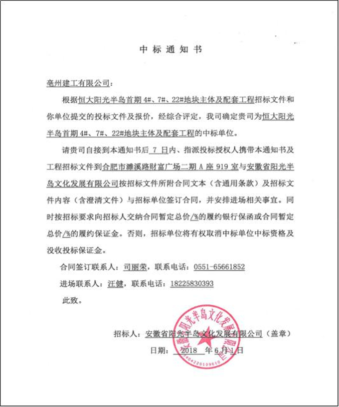 6月1日,亳州建工收到大型知名房企恒大地產(chǎn)集團有限公司匠心打造的旅居巨作——“恒大陽光半島項目”首期4#、7#、22#地塊主體及配套工程中標(biāo)通知書,中標(biāo)金額3.6億元。