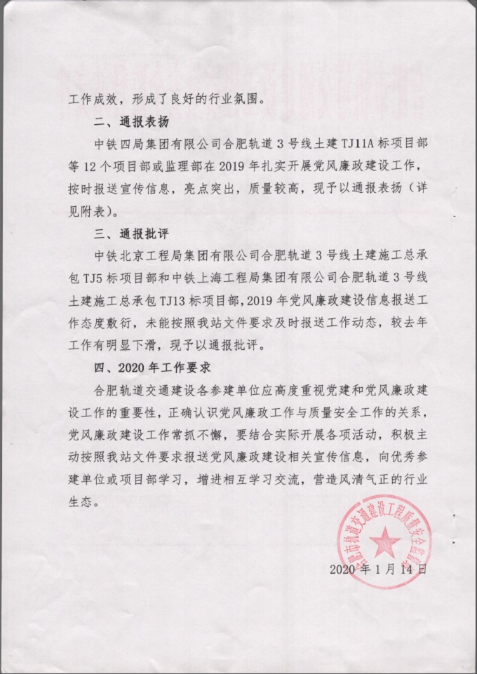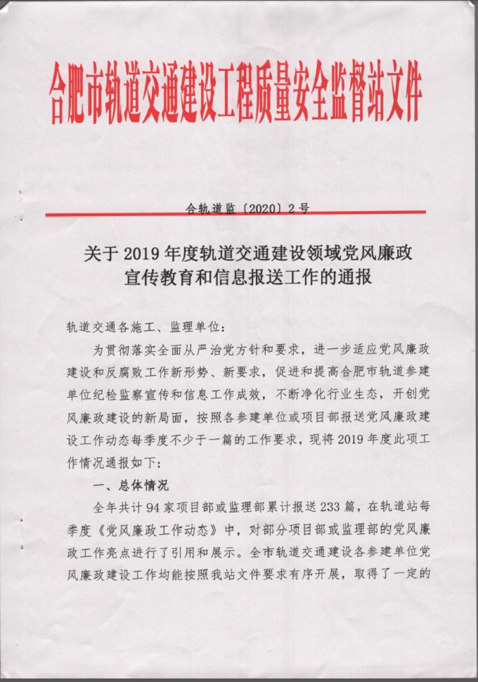 近日,市城鄉(xiāng)建設(shè)局軌道站印發(fā)《關(guān)于2019年度軌道交通建設(shè)領(lǐng)域黨風(fēng)廉政宣傳教育和信息報送工作的通報》,合肥軌道交通4號線TJ03標(biāo)項目部在黨建工作中表現(xiàn)突出,受到通報表揚,這是該項目部黨建工作連續(xù)第三年獲得行政主管部門的通報表揚。