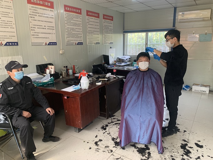 受新冠肺炎疫情的影響,理發(fā)店暫停營業(yè),理發(fā)成為了一大難題。項目支部了解這一情況后,將社區(qū)理發(fā)師請至工地,為返崗職工提供免費理發(fā)服務。