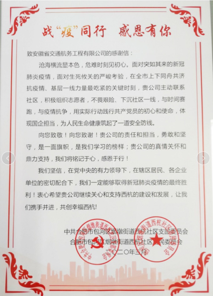 3月27日,包河區(qū)煙墩街道西杭社區(qū)為安徽交航公司送來一封感謝信。感謝信寫到:滄海橫流顯本色,危難時(shí)刻見初心。面對突如其來的新冠肺炎疫情,面對生死攸關(guān)的嚴(yán)峻考驗(yàn),在全市上下同舟共濟(jì)抗疫情、基層一線力量最吃緊的關(guān)鍵時(shí)刻,貴公司主動(dòng)聯(lián)系社區(qū),積極組織志愿者,不畏艱險(xiǎn)、下沉社區(qū)一線,與時(shí)間賽跑,與疫情抗?fàn)帲脤?shí)際行動(dòng)踐行共產(chǎn)黨員的初心和使命,體現(xiàn)國企擔(dān)當(dāng),為人民生命健康筑起了一道安全防線。