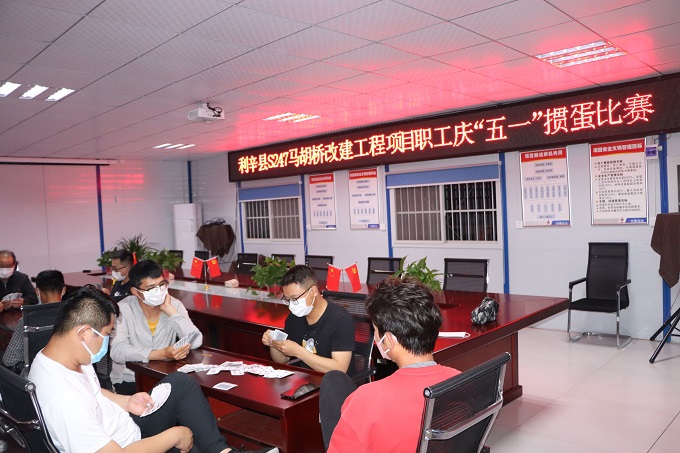 在5月1日當天晚上,利辛縣S247馬胡橋改建工程項目部利用晚餐后時間,積極組織全體員工在項目會議室舉辦摜蛋比賽,本著“公平、公開、公正”的原則,員工自由組隊通過抽簽決定對手。比賽中,選手組員之間密切配合,相互切磋牌技,歡聲笑語此起彼伏,經過多輪次比拼,最終選拔出一等獎一組、二等獎一組、三等獎一組,最后項目經理為一二三等獎獲得者頒發(fā)了獎品。