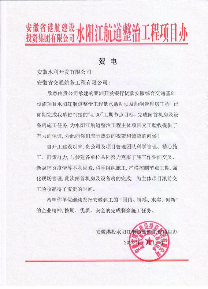 5月11日,安徽港投水陽江航道治理工程項(xiàng)目辦發(fā)來《賀電》,對(duì)安徽交航公司水陽江項(xiàng)目部如期完成“4.30”工期節(jié)點(diǎn)目標(biāo)和閘首機(jī)房及設(shè)備房施工任務(wù)給予了高度稱頌。這是項(xiàng)目開工以來的首個(gè)節(jié)點(diǎn)工期目標(biāo),它的如期完成將為后續(xù)各項(xiàng)施工奠定堅(jiān)實(shí)基礎(chǔ)。