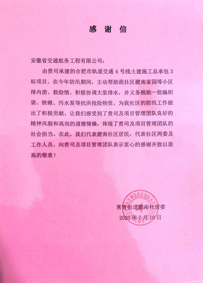 7月28日早上,安徽交航合軌4號線TJ03標(biāo)項目部收到一封來自駐地社居委送來的感謝信,對項目部主動幫助社區(qū)排內(nèi)澇、救險情以及義務(wù)捐助防汛物資的志愿服務(wù)行動給予了高度贊揚,并表達了由衷感謝。