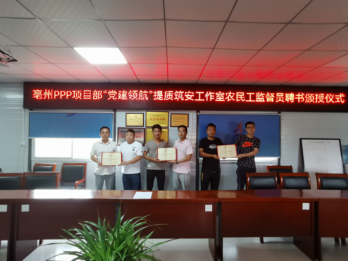 為推動公司新時代文明實(shí)踐點(diǎn)“黨建領(lǐng)航”提質(zhì)筑安工作走深走實(shí),日前,亳州PPP項(xiàng)目新時代文明實(shí)踐點(diǎn)舉行農(nóng)民工監(jiān)督員聘任儀式。經(jīng)過前期推薦、審核、考察、公示等一些列環(huán)節(jié),最終有3名農(nóng)民工符合規(guī)定要求,正式被聘任為農(nóng)民工監(jiān)督員。