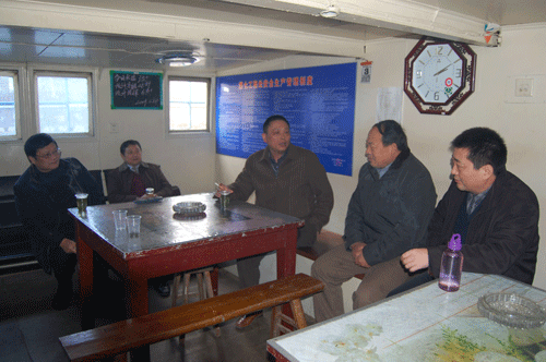 李世龍總經(jīng)理(左一)一行聽(tīng)取臨泉大橋項(xiàng)目部經(jīng)理經(jīng)理匯報(bào)工程建設(shè)情況