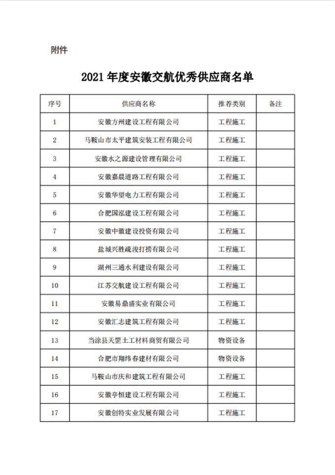 為進(jìn)一步規(guī)范公司供應(yīng)商管理,提高供應(yīng)商履約意識,促進(jìn)建立長期穩(wěn)定的供應(yīng)商合作關(guān)系,根據(jù)《安徽建工集團(tuán)股份有限公司供應(yīng)商管理辦法》、《安徽省交通航務(wù)工程有限公司供應(yīng)商管理辦法》等有關(guān)規(guī)定,經(jīng)所屬單位按照優(yōu)秀供應(yīng)商入庫條件并考核推薦,公司審核并報總辦會審議通過?,F(xiàn)公布2021年度公司優(yōu)秀供應(yīng)商名單。