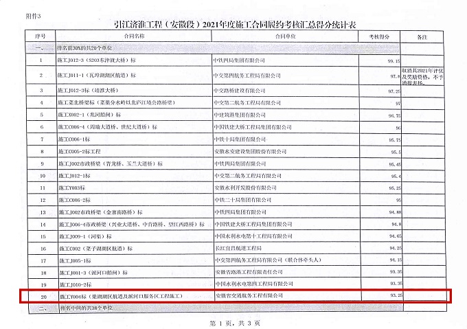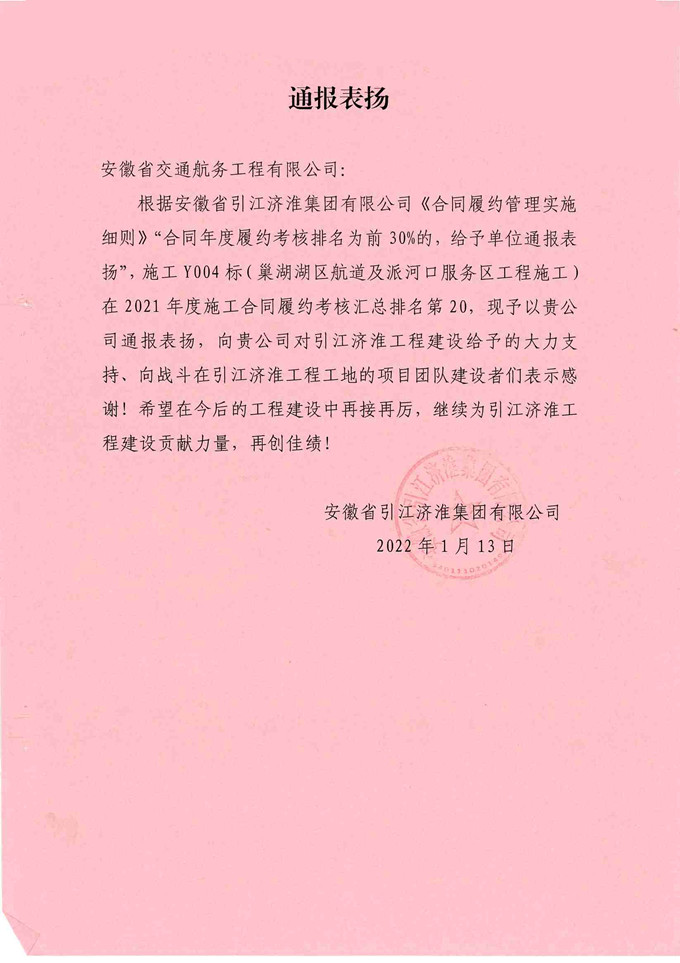 日前,安徽交航公司承建的引江濟(jì)淮工程(安徽段)巢湖湖區(qū)航道及派河口服務(wù)區(qū)工程,在2021年度施工合同履約考核匯總排名中位列前30%,受到業(yè)主單位省引江濟(jì)淮集團(tuán)通報(bào)表揚(yáng)。