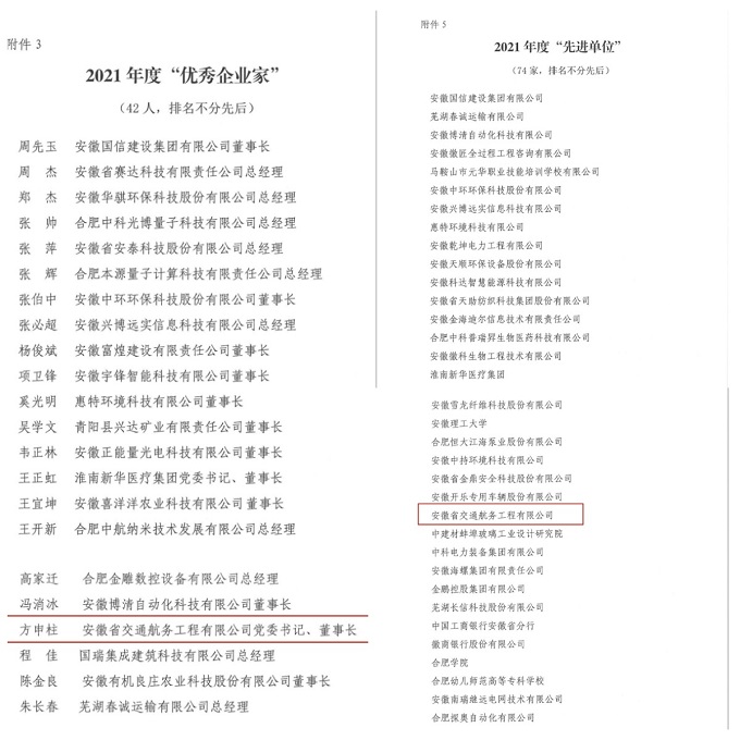 安徽交航公司喜獲兩項(xiàng)榮譽(yù)獎(jiǎng)項(xiàng),安徽交航公司喜獲2021年度“先進(jìn)單位”榮譽(yù)獎(jiǎng)項(xiàng),公司黨委書記、董事長方申柱榮獲2021年度“優(yōu)秀企業(yè)家”榮譽(yù)獎(jiǎng)項(xiàng)。方申柱作為獲獎(jiǎng)代表發(fā)言,發(fā)言中他簡要介紹了安徽交航公司和安徽生態(tài)科技公司運(yùn)營情況,他表示將加強(qiáng)同科學(xué)家企業(yè)家協(xié)會(huì)的聯(lián)系,希望協(xié)會(huì)協(xié)會(huì)提供更多針對(duì)性服務(wù),在技術(shù)上給予更大支持,發(fā)揮院士、專家、學(xué)者等幫助企業(yè)技術(shù)創(chuàng)新的作用。
