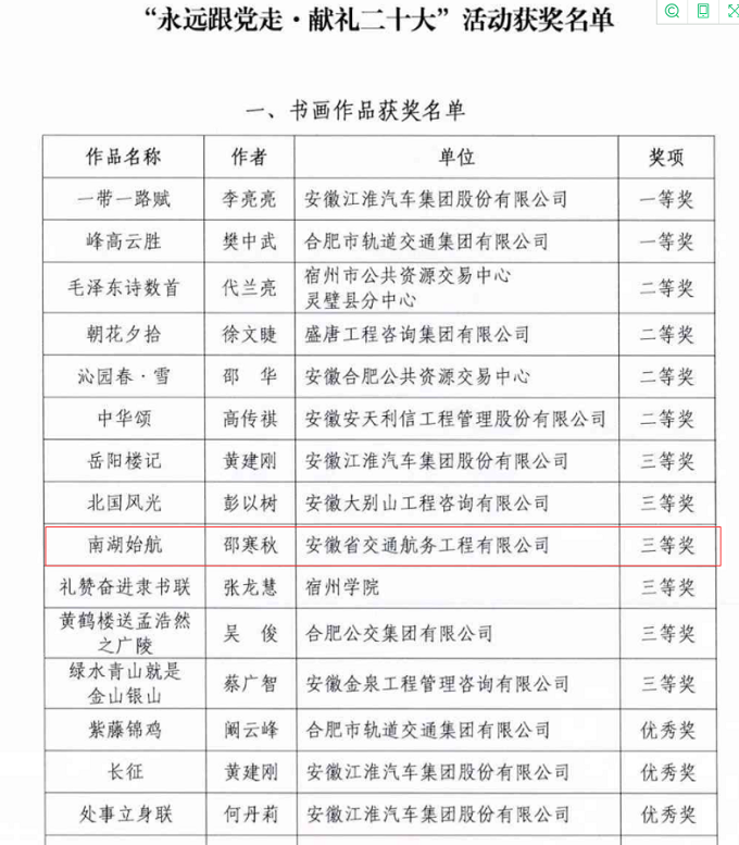 日前,由安徽省招標(biāo)采購協(xié)會主辦的“永遠(yuǎn)跟黨走·獻(xiàn)禮二十大”作品征集評選活動獲獎作品名單揭曉!經(jīng)過激烈競爭,安徽交航公司《南湖始航》書法作品榮獲書畫類作品三等獎。