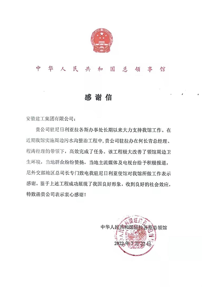 7月22日,安徽建工集團(tuán)收到中國駐拉各斯總領(lǐng)館感謝信,對安徽建工駐尼日利亞拉各斯辦事處優(yōu)質(zhì)高效完成使館外圍環(huán)保整治工程表示感謝。
