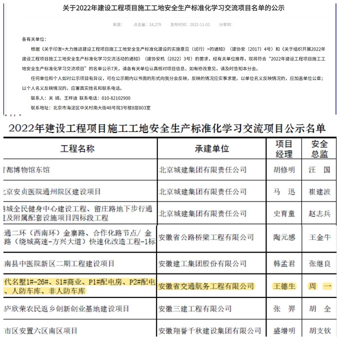 近日,從中國建筑業(yè)協(xié)會(huì)網(wǎng)站獲悉,由安徽交航公司承建的滁州時(shí)代名墅項(xiàng)目榮獲“2022年建設(shè)工程項(xiàng)目施工工地安全生產(chǎn)標(biāo)準(zhǔn)化”(原“國家AAA級(jí)”)榮譽(yù)稱號(hào)。
