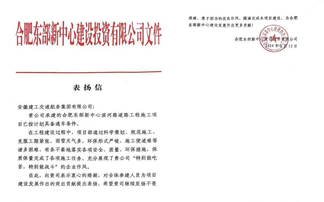 濱河路道路工程施工項目位于合肥市瑤海區(qū)東部新中心,2023年7月開工,項目建成后,將進一步緩解城區(qū)交通壓力。5月15日,合肥市東部新中心建設投資有限公司向公司發(fā)來表揚信,對項目部攻克工期緊張、環(huán)保形勢嚴峻、施工便道不暢等諸多難題,保質(zhì)保量完成施工任務提出表揚。