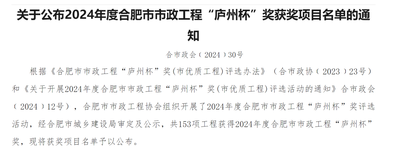 近日,經(jīng)合肥市城鄉(xiāng)建設(shè)局審定,合肥市市政工程協(xié)會(huì)正式公布2024年度合肥市市政工程“廬州杯”獲獎(jiǎng)項(xiàng)目名單,我公司承建的瑤海區(qū)板橋河初期雨水徑流污染控制工程項(xiàng)目順利通過評(píng)審,榜上有名。