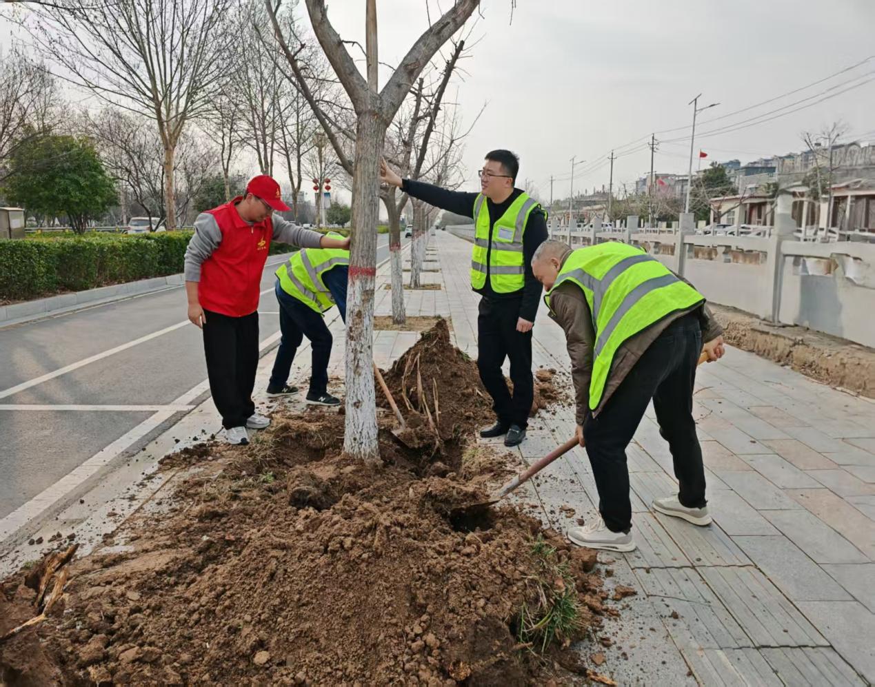 活動現(xiàn)場,黨員干部們熱情高漲、干勁十足。大家分工協(xié)作,揮鍬培土、扶苗圍堰、提水澆灌,每一道工序都一絲不茍。經過數(shù)小時的辛勤勞動,共栽培、修復樹木20余株,為初春的大地增添了一抹盎然綠意。