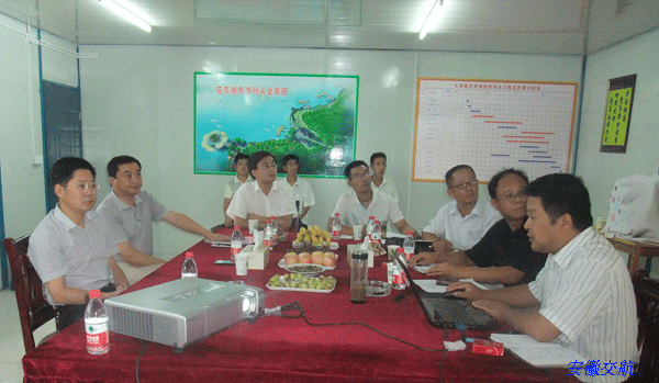 2011年9月8日下午,太湖縣常務副縣長、花亭湖項目分管領導李琳在縣花管處常務副主任汪從永等的陪同下,來到花亭湖旅游碼頭工程施工現場,檢查工程施工進展情況。在駐地會議室,項目經理衛邦齊向李縣長匯報了關于工程施工進度、工程質量、施工安全以及施工中遇到的困難等方面的情況。公司副總經理劉朝發陪同檢查。